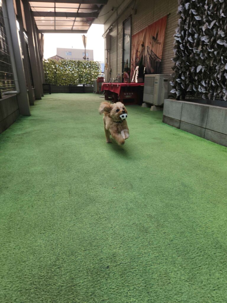 カフェの奥には、小型犬が走り回るのに十分な広さのミニドッグランが装備されています。一部に屋根が付いているエリアもあり、日差しや小雨を避けられるのも嬉しいポイントです。