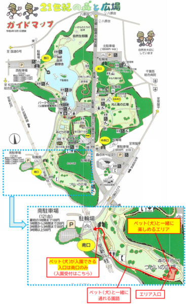 - 利用可能エリア: 「ペット(犬)と一緒に楽しめるエリア」と、そこへ至る「ペット(犬)と一緒に通れる園路」のみ