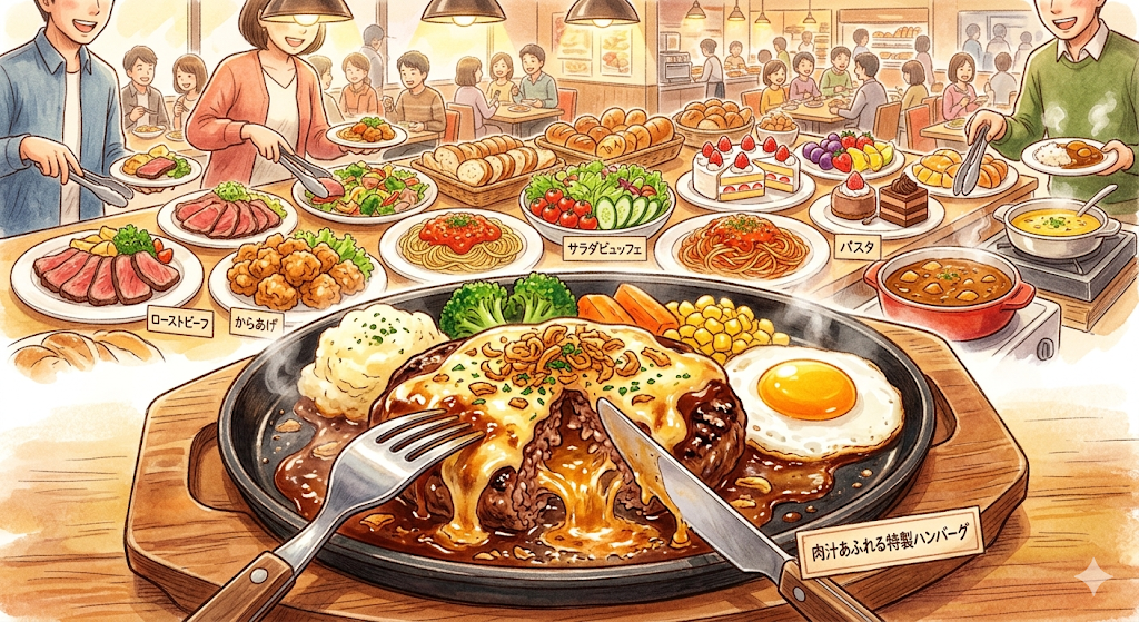 ワンちゃんへのホスピタリティや、メインのハンバーグの味については絶賛の声が多数!一方で、混雑時はビュッフェコーナーの管理や提供スピードに課題が出ることがあるようです。ゆっくり楽しみたい方は、少しピークタイムをずらして訪問するのがおすすめですよ!
